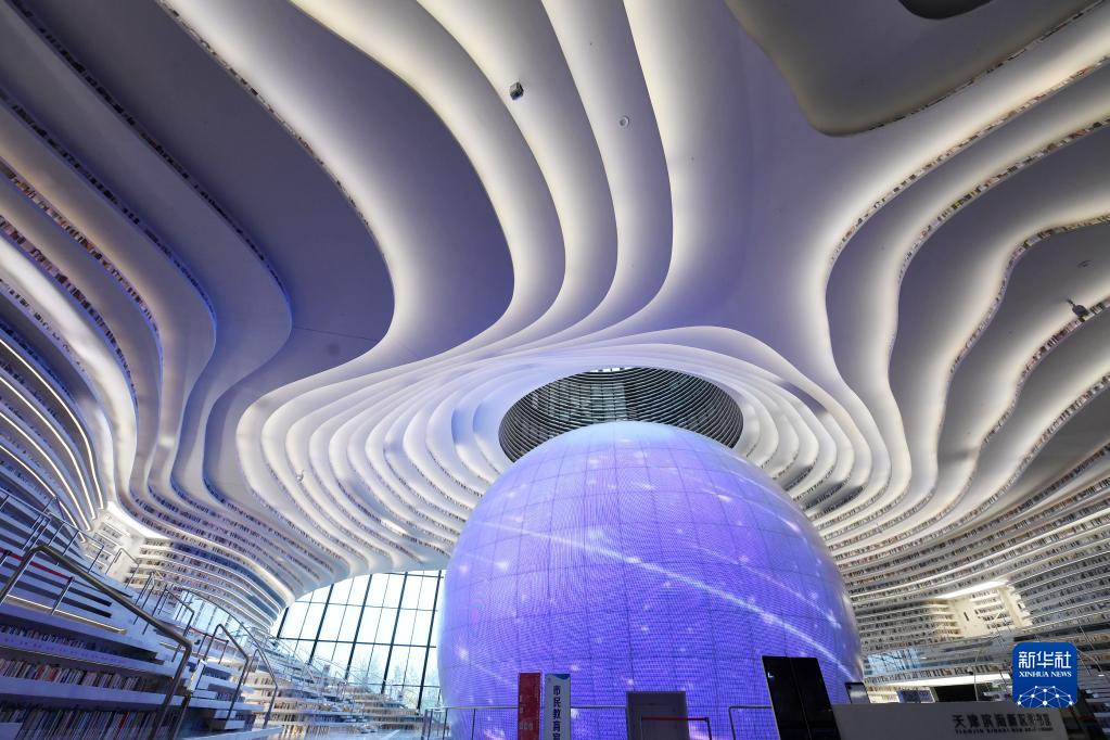 有着“滨海之眼”之称的滨海新区图书馆位于天津滨海文化中心,于2017年10月正式开馆,目前已成为天津滨海新区的文化“新地标”。“滨海之眼”的内里是图书馆中庭,中庭空间形象由“书山”和中间的球体构成。球体是“滨海之眼”的“眼球”,也是一个多功能厅,配置有环绕立体声和数字放映功能;“书山”则由34层阶梯平台构成。