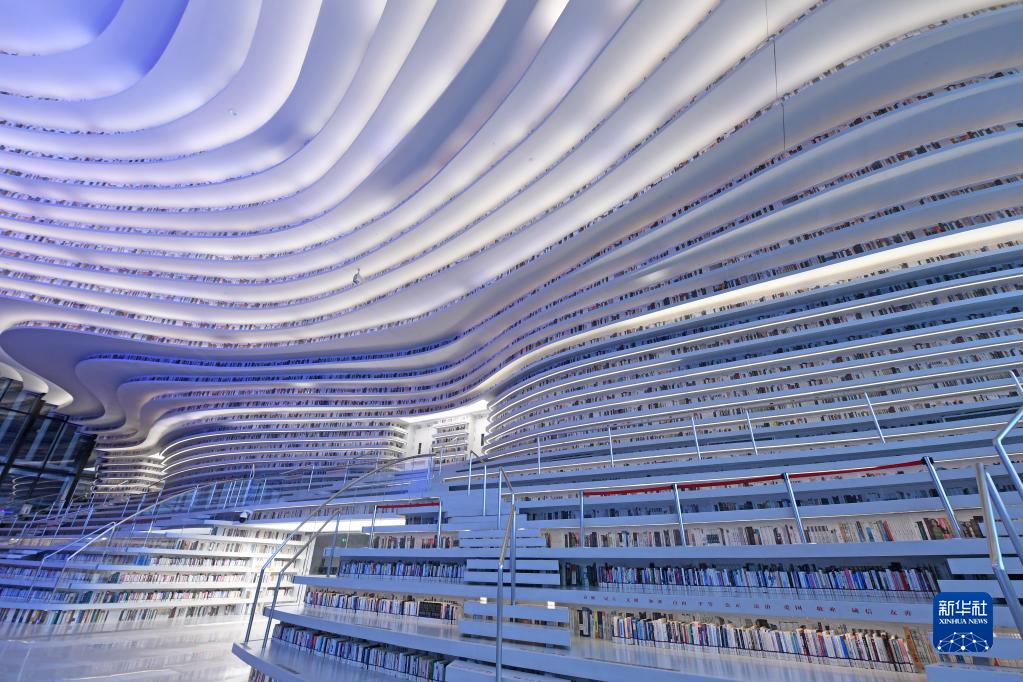 有着“滨海之眼”之称的滨海新区图书馆位于天津滨海文化中心,于2017年10月正式开馆,目前已成为天津滨海新区的文化“新地标”?!氨鹾V邸钡哪诶锸峭际楣葜型ィ型タ占湫蜗笥伞笆樯健焙椭屑涞那蛱骞钩?。球体是“滨海之眼”的“眼球”,也是一个多功能厅,配置有环绕立体声和数字放映功能;“书山”则由34层阶梯平台构成。