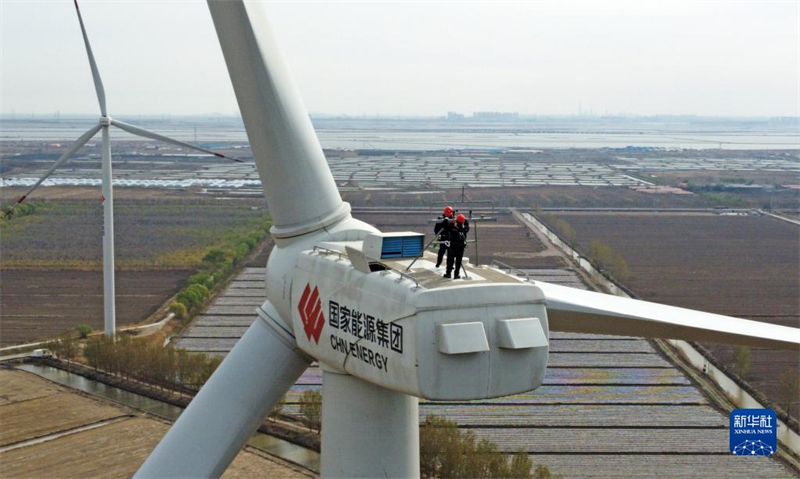 在位于天津市滨海新区的国家能源集团龙源电力汉沽风电场,刘彦波和同事胡众银对风机进行检修作业(4月13日摄,无人机照片)。