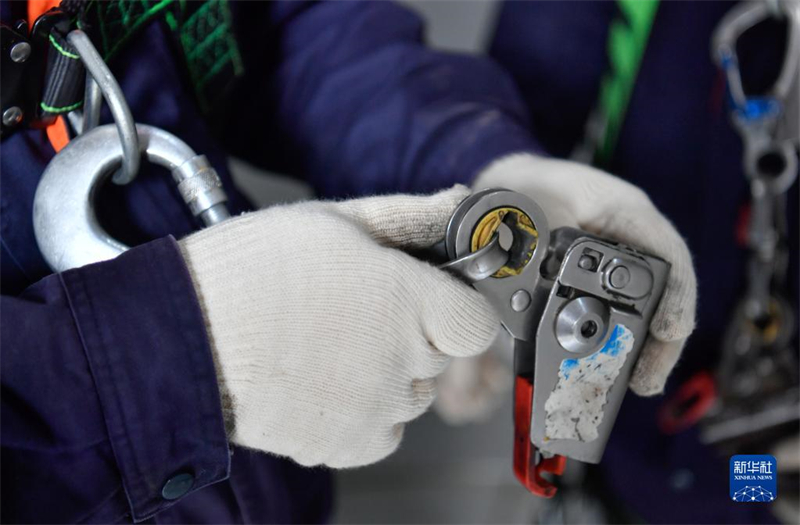 刘彦波在登塔检修前检查防护装备(4月11日摄)。