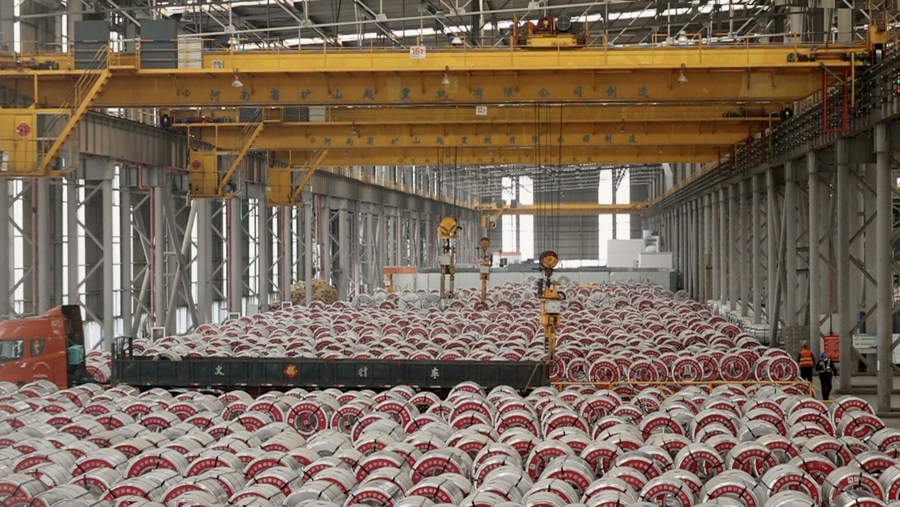 Steel coils are to be delivered to domestic and overseas customers in a warehouse of Tianjin Xinyu Color Plate Co., Ltd. in Tianjin, north China, Feb. 2, 2023. (Xinhua)