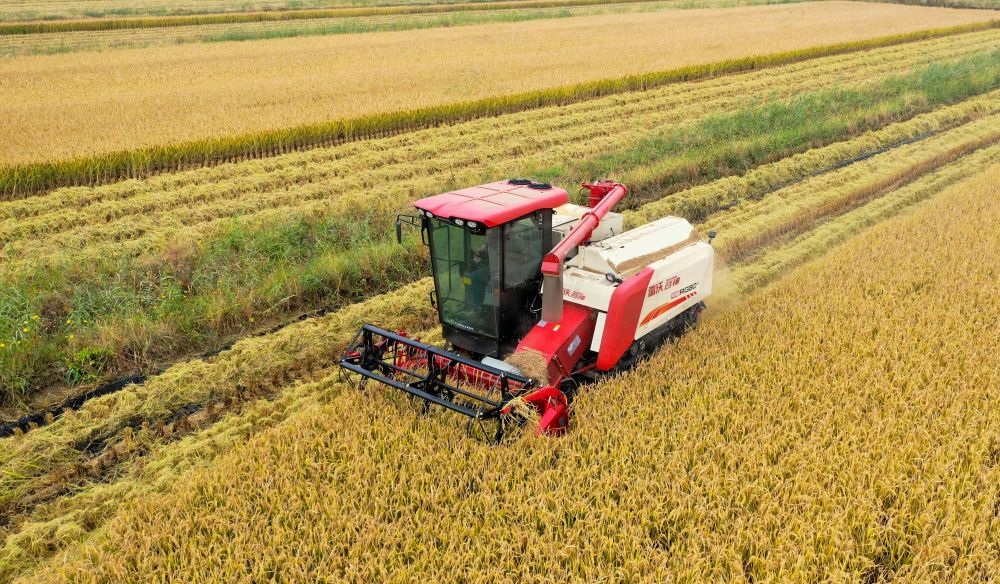 在天津市津南区小站镇坨子地村,水稻收割机在田间作业。新华社记者孙凡越摄