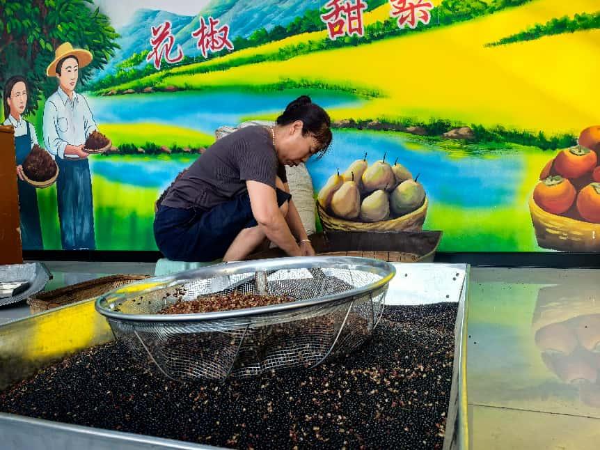 伏花椒基地外,是村民们汗涔涔地送来自己这一天新采摘的鲜花椒,又喜洋洋地带着现金离去;伏花椒基地内,一颗颗鲜红欲滴的花椒,在经历了晾晒、去籽、精心包装等一系列流程后,被工作人员细心地安置在印有“庄果峪伏花椒”字样的精美礼盒内。